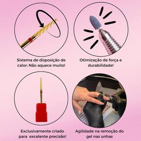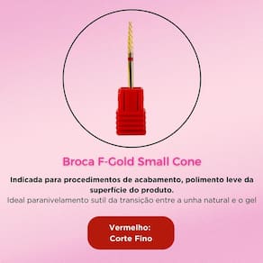 A broca ideal para profissionais que fazem alongamentos de unhas em todas as técnicas, com corte fino para unhas, F-Gold Small Cone é uma ferramenta delicada e precisa, com formato cônico e acabamento dourado, ideal para trabalhos detalhados como o acabamento próximo à cutícula, a limpeza de sulcos e o polimento suave da superfície da unha.