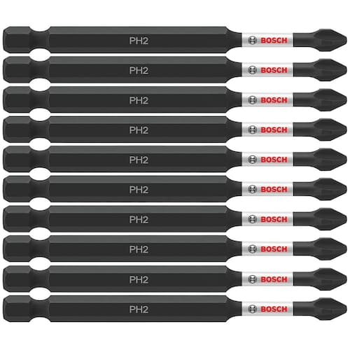 BOSCH ITPH235B Pacote com 10 brocas Phillips nº 2 para parafusamento resistente a impactos - Vida útil 10 vezes acima das brocas de impacto padrão - A zona de torção Xtended ajuda a absorver alto torque de novos acionadores de impacto - Pontas projetadas com precisão para um ajuste mais apertado e menos CAM - Fabricação com tratamento térmico para uma broca mais forte - Manga de alta visibilidade com marcações gravadas a laser para conveniência do usuário