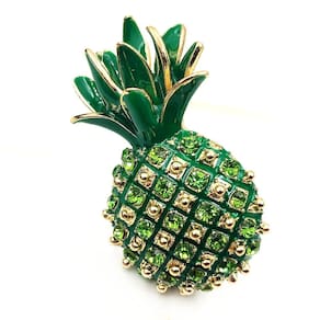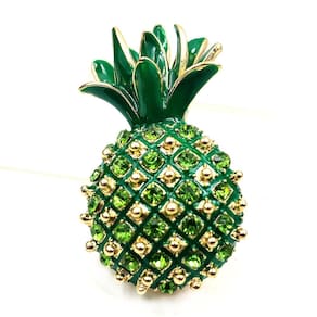 Este lindo e fofo broche micropavimentado de abacaxi de cristal amarelo banhado a ouro, decora com folhas esmaltadas brilhantes, joias muito bonitas e clássicas de frutas tropicais ou alimentos para suas férias de verão - Estes lindos e fofos broches de abacaxi de cristal amarelo micropavimentado banhados a ouro, decoração de folhas esmaltadas brilhantes, joias muito bonitas e clássicas de frutas tropicais ou joias gastronômicas para suas joias de praia nas férias de verão. Também é um presente especial para amantes de abacaxi - Tipo: alfinetes de broche - Formato: abacaxi - Estilo: clássico, materiais: liga, cristal - Tamanho: 1,97 polegadas e 0,98 polegadas - Nome do estilo: broche, clássico - Nome do departamento: feminino - Tipo de configuração: configuração de 4 pinos