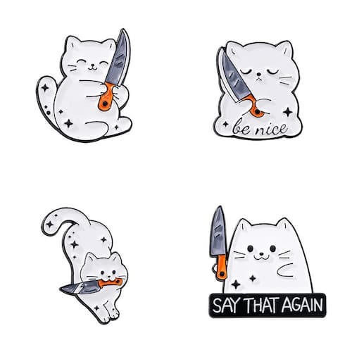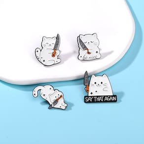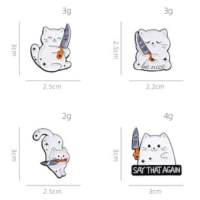 Material: liga Tamanho: 2,5 x 3 cm Peso: 12 g Quantidade: você receberá todas as peças em quantidade igual à primeira foto principal ShowPlayful Cat Knife Design: apresenta gatos brancos de desenhos animados segurando facas em poses engraçadas, fazendo uma declaração ousada e peculiar. Material de liga durável: feito de liga resistente com revestimento de esmalte para textura suave, cores vivas e desgaste duradouro. Acessórios versáteis: funcionam como alfinetes de blusa, broche, broche de lapela ou crachá, perfeitos para jaquetas, mochilas, chapéus e cachecóis. Compacto e leve: cada peça mede cerca de 2,5 x 3 cm e pesa 12 g, fácil de colocar sem aumentar o volume. Estilo exclusivo para todos: uma opção divertida de acessório para mulheres, homens e adolescentes que gostam de moda não convencional e divertida com temas de animais.