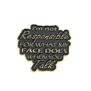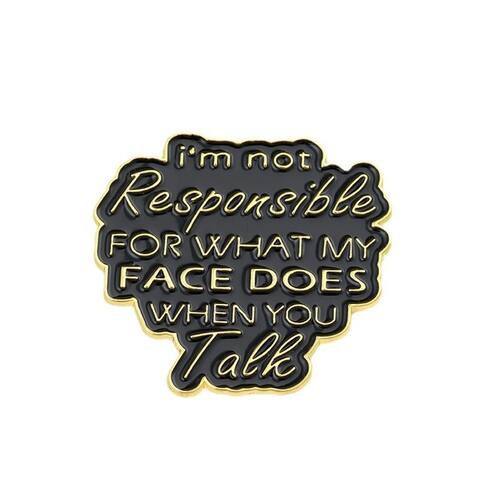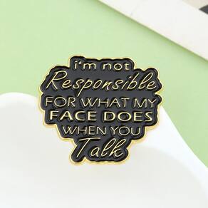 Material: liga. Tamanho: 3 x 2,8 cm. Quantidade: você receberá toda a quantidade de peças da mesma imagem principal. ShowQuote Design — Apresenta a frase inteligente “Não sou responsável pelo que meu rosto faz quando você fala” em letras douradas, tornando-o um acessório divertido. Material de liga — Feito de liga durável com revestimento de esmalte polido, garantindo brilho duradouro, superfície lisa e resistência ao desbotamento. Acabamento em preto e dourado — O contraste ousado do fundo preto com o texto dourado cria uma aparência elegante e atraente para qualquer roupa. Alfinete decorativo — perfeito como alfinete de blusa, lapela ou crachá para jaquetas, camisas, mochilas e chapéus, adicionando personalidade e diversão à sua moda. E leve — Projetado para homens e mulheres, adequado para roupas casuais, de trabalho ou de rua, oferecendo um acessório diário confortável e estiloso.