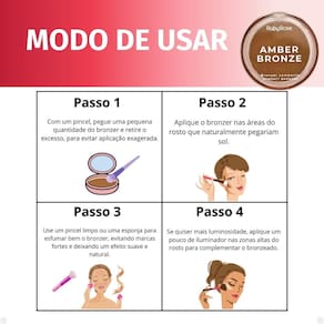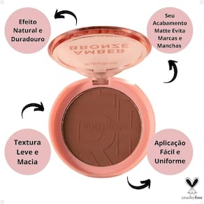 O Amber Bronze é o bronzer compacto que vai te proporcionar aquele efeito bronzeado natural e luminoso, sua fórmula leve e fácil de esfumar proporciona um acabamento suave, deixando a pele com um brilho saudável e natural, perfeito para o dia a dia ou para um visual de verão.