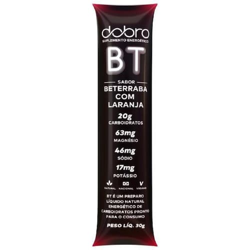 BT Gel Laranja com Beterraba Energia Dobro 30g possui: 20g de carboidrato, 63mg de magnésio, 46mg de sódio, 17mg de potássio, 1/3 de beterraba. Quando consumir BT GEL 5 minutos antes de uma atividade, a cada 45 minutos de atividade de longa duração ou pós treino para recuperação.