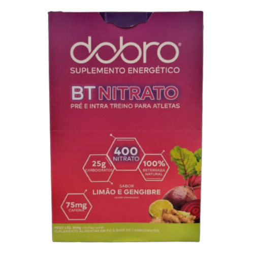 O BT Nitrato Limão e Gengibre Sachê 30g Dobro 10 Unidades é um suplemento com 25g de carboidratos e 400mg de nitrato proveniente da beterraba. Produtos de nutrição esportiva ricos em nitrato podem ter um impacto direto na eficiência energética e, como resultado, melhorar o desempenho do atleta, através do aumento de óxido nítrico e consequente melhora da circulação e redução do custo de oxigênio durante o exercício.