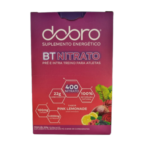 O BT Nitrato Pink Lemonade com Citrulina Sachê 30g Dobro 10 Unidades é um suplemento com 25g de carboidratos e 400mg de nitrato proveniente da beterraba. Produtos de nutrição esportiva ricos em nitrato podem ter um impacto direto na eficiência energética e, como resultado, melhorar o desempenho do atleta, através do aumento de óxido nítrico e consequente melhora da circulação e redução do custo de oxigênio durante o exercício.