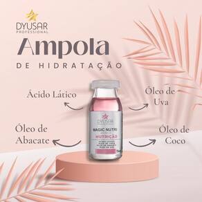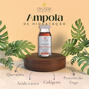 B.Tox de Cristal Matizador Sem Formol 300ml Dyusar Professional Hair Descrição: Tratamento capilar sem formol, ideal para matização e hidratação intensa dos fios. Ingredientes e Benefícios: Extrato de Açaí: Rico em proteínas, vitaminas C, B1 e B2, e minerais como fósforo, ferro e cálcio. de Karité: Nutre e hidrata profundamente, protege contra calor e raios UV. Proteína de Trigo: Protege e restaura a flexibilidade natural dos cabelos. Pantenol Vitamina B5 : Hidrata, previne danos, reduz pontas duplas e auxilia no crescimento dos cabelos. Ácido Lático: Reforça a fibra capilar e proporciona reconstrução profunda até o córtex. Modo de Uso: Aplique mecha a mecha, iniciando pela raiz e respeitando uma distância de 0,5 cm da raiz. Deixe agir de 50 a 60 minutos. Enxágue em água corrente, seque com escova e finalize como desejar. Precauções: Uso externo. Não ingerir. Manter fora do alcance de crianças e em local fresco. Uso não recomendado para pessoas sensíveis a qualquer componente. Evitar contato com os olhos; em caso de contato, enxaguar abundantemente com água. Produto aprovado pela ANVISA. Ampola De Nutrição Magic Nutri 15ml Dyusar Professional Hair Descrição: Ampola que nutre e revitaliza os cabelos, proporcionando hidratação profunda e fortalecimento. Ingredientes e Benefícios: Ácido Lático: Reforça e reconstrói a fibra capilar. Óleo de Coco: Cria uma película protetora e fortalece a estrutura capilar. Óleo de Uva: Ação antioxidante que revitaliza os cabelos. Óleo de Abacate: Oferece alta nutrição e hidratação. Modo de Uso: Misture com água até formar um creme consistente. Aplique nos cabelos úmidos após lavagem, deixe agir de 3 a 10 minutos e enxágue. Precauções: Uso externo. Manter fora do alcance de crianças. Evitar contato com os olhos; em caso de contato, enxaguar abundantemente com água. Produto aprovado pela ANVISA. Ampola De Hidratação Magic Hidra 15ml Dyusar Professional Hair Descrição: Ampola que proporciona hidratação profunda e controle do frizz, restaurando a maciez e o brilho. Ingredientes e Benefícios: Glicerina-bi-destilada: Promove maciez, brilho e controle do frizz. Lipídios Botânicos: Hidratação profunda para cabelos ressecados. Ácido Lático: Reforça a fibra capilar e proporciona reconstrução. Pantenol Vitamina B5 : Hidrata, previne danos e auxilia no crescimento dos cabelos. Modo de Uso: Misture com água até formar um creme consistente. Aplique nos cabelos úmidos após lavagem, deixe agir de 3 a 10 minutos e enxágue. Precauções: Uso externo. Manter fora do alcance de crianças. Evitar contato com os olhos; em caso de contato, enxaguar abundantemente com água. Produto aprovado pela ANVISA. Ampola De Reconstrução Magic Recon 15ml Dyusar Professional Hair Descrição: Ampola ideal para restaurar a estrutura dos cabelos, proporcionando uma reconstrução completa. Ingredientes e Benefícios: Proteína do Trigo: Restaura a flexibilidade natural dos cabelos. Ácido Lático: Reforça a fibra capilar e proporciona reconstrução. Colágeno e Queratina: Reconstroem a fibra capilar, proporcionando resistência e brilho. Modo de Uso: Misture com água até formar um creme consistente. Aplique nos cabelos úmidos após lavagem, deixe agir de 3 a 10 minutos e enxágue. Precauções: Uso externo. Manter fora do alcance de crianças. Evitar contato com os olhos; em caso de contato, enxaguar abundantemente com água. Produto aprovado pela ANVISA.