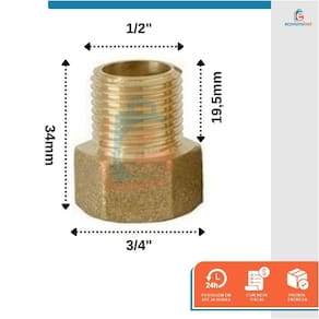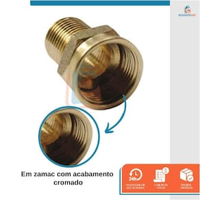 Características técnicas: Material: Zamac Pressão de operação: 3 a 40 m.c.a Rosca Macho: 1/2” Rosca Fêmea: 3/4” Comprimento aproximado: 3,4cm Compatível: Torneiras convencionais, máquina de lavar roupa, máquina de lavar louça Peso: 0,035kg Marca: Garden Ref.: 2023431