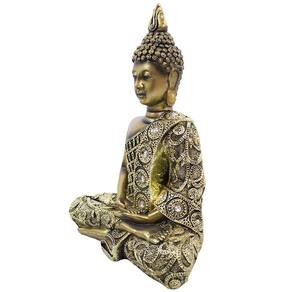 Buda toda na cor dourada, finamente trabalhada nos detalhes. Vestimentas ornamentadas com pequenas pedras transparentes. Buda na posição Dhyana Mudra. Material: resina Medias: 17cm