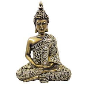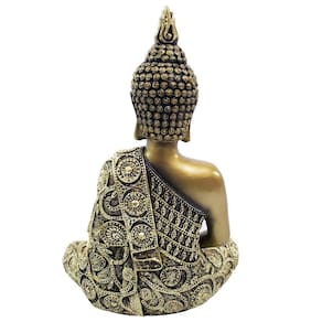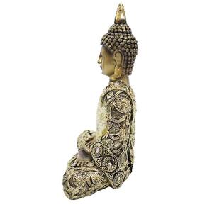 Buda toda na cor dourada, finamente trabalhada nos detalhes. Vestimentas ornamentadas com pequenas pedras transparentes. Buda na posição Dhyana Mudra. Material: resina Medias: 17cm