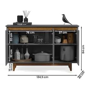Dimensões do produto: Altura: 84 cm Largura: 124,5 cm Profundidade: 40 cm Observações: Feita em MDP/MDF de 15mm; 3 Portas de abrir; Possui dobradiças laterais metalica; 2 Prateleiras internas; 4 pés fixos de 15cm em madeira pinus; Suporta até 25kg distribuídos. Itens Incluso: 01 Buffet. Kit completo para montagem. Manual de montagem. Observações: Não nos responsabilizamos pela montagem do produto. Sistema de Montagem: Parafusos, Cavilhas e Tampos. É recomendado que a montagem seja feita por um profissional qualificado. As imagens indicam uma sugestão de uso e são apenas ilustrativas, os objetos decorativos não estão inclusos. Ao iniciar a montagem, forre o chão com o papelão das embalagens para proteger as peças de arranhões. Instruções e Cuidados: Limpar com pano seco, manter em lugar livre de umidade, ao abrigo de exposição direta ao sol.