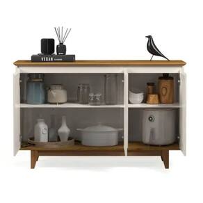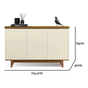 Dimensões do produto: Altura: 84 cm Largura: 124,5 cm Profundidade: 40 cm Observações: Feita em MDP/MDF de 15mm; 3 Portas de abrir; Possui dobradiças laterais metalica; 2 Prateleiras internas; 4 pés fixos de 15cm em madeira pinus; Suporta até 25kg distribuídos. Itens Incluso: 01 Buffet. Kit completo para montagem. Manual de montagem. Observações: Não nos responsabilizamos pela montagem do produto. Sistema de Montagem: Parafusos, Cavilhas e Tampos. É recomendado que a montagem seja feita por um profissional qualificado. As imagens indicam uma sugestão de uso e são apenas ilustrativas, os objetos decorativos não estão inclusos. Ao iniciar a montagem, forre o chão com o papelão das embalagens para proteger as peças de arranhões. Instruções e Cuidados: Limpar com pano seco, manter em lugar livre de umidade, ao abrigo de exposição direta ao sol.