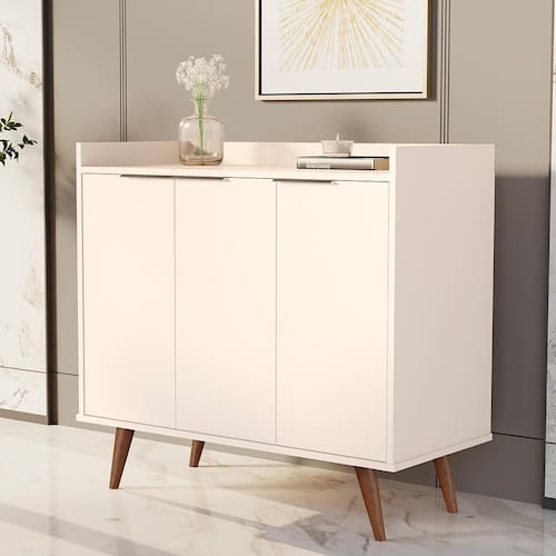 Contém uma prateleira interno e um amplo espaço para organizar elementos diários de diversos tamanhos, conta também com um tampo espaçoso que pode ser utilizado apra acomodar os objetos decorativos.