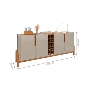 Possui pés em madeira maciça, e adega com nichos para até 10 garrafas.