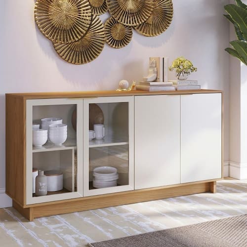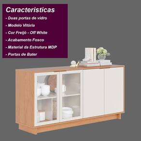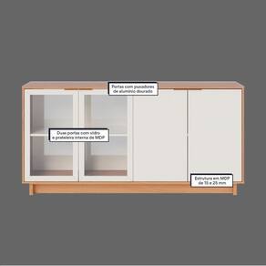 Com a mistura de elementos minimalista e retrô, o buffet Vitória é um móvel cheio de personalidade e indicado para deixar sua sala de jantar ou estar, ainda mais charmosa. Possui quatro portas, sendo duas em vidro e as outras duas em mdf, ambas com três divisórias internas e puxadores metálicos dourados. É ideal para armazenar aparelhos de jantar, travessas e copos. Seu tampo também pode ser utilizado como apoio para objetos decorativos, bebidas ou até mesmo como bancada para acomodar utensílios para servir drinques e petiscos.
