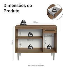 As medidas finais do balcão são: 88cm de altura, 105cm de largura e 44cm de profundidade.