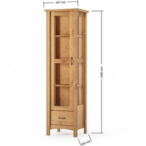 A Cristaleira é feita em Madeira de Pinus de Reflorestamento, Maciço,e acabamento em verniz fosco. A Cristaleira de Madeira conta com 1 porta de vidro com dobradiças de pressão, 1 gaveta com corrediças telescópicas e puxadores em metal na cor ouro envelhecido.