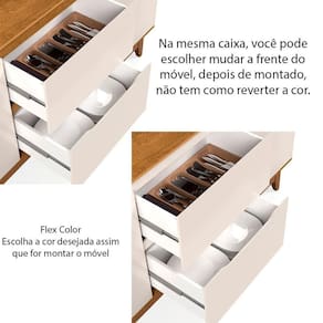 Características do Buffet para Sala de Jantar Flop: - Produzida em mdp/mdf; - Acabamento de pintura fosco/brilho; - 2 gavetas com corrediças telescópicas, proporcionando abertura total; - 2 portas com dobradiças metálicas; - Acompanha prateleira interna; - Sistema Flexcolor, na hora de montar o móvel, escolha a cor da frente do balcão aparador, depois que escolher, não tem como reverter devido as furações;