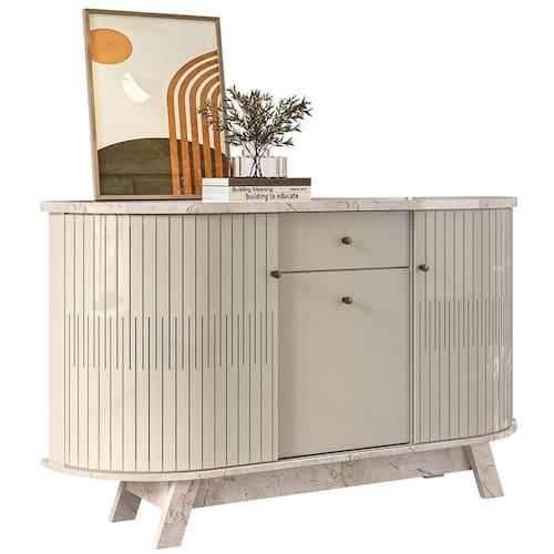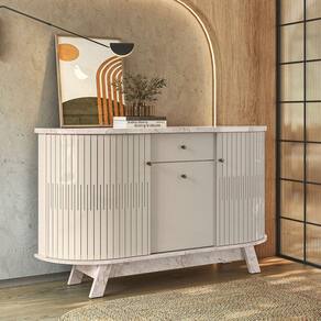 Características do Buffet Aparador para Sala de Jantar: - Produzida em mdp de 15 e 25mm; - Acabamento de pintura UV; - 4 Pés palito; - 2 portas íveis em MDF; - 1 porta com dobradiças metálicas; - 1 gaveta com corrediças telescópicas; - 3 Prateleiras; - Puxadores em poliestireno; - Tampo e base com detalhes curvos; - Não acompanha objetos de decoração;