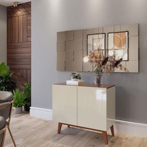 Buffet Aparador Ares 2 Portas Off White Com Freijó - Moveisaqui O Buffet Aparador Ares 2 Portas - MoveisAqui é a peça que faltava para complementar sua sala de jantar. Seu design clean com cava no lugar de puxadores e pés em madeira garante o requinte e delicadeza que você busca para agregar o seu ambiente. Seu amplo espaço interno com divisórias auxiliam na organização e praticidade do ões do Produto Montado:Altura: 77 cmLargura: 81,5 cmProfundidade: 39,5 cmObservações:- Fabricado em MDF e MDP;- Portas com cava que substitui puxadores;- 2 portas com dobradiças metálicas;- Pés em madeira;- Pintura ultravioleta com acabamento brilho na cor off white;- Pintura ultravioleta com acabamento amadeirado na cor freijó. Marca: Não Informado