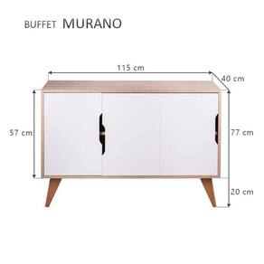 Buffet / Aparador / Balcão Modelo Murano cor Carvalho Treviso (Madeira Clara) com 3 portas o móvel perfeito para deixar seu ambiente com estilo e organizado. Possui dois compartimentos internos divididos por uma prateleira e 3 portas cor Brancas, conjunto apoiado em lindos pés torneados em madeira maciça. O móvel apresenta um estilo clean sem puxadores, apenas um recorte nas portas para abrir e fechar. As portas possuem um sistema de fechamento lento, que permite o uso com mais praticidade e conforto com apenas um leve toque. Montagem: Vai desmontado. Cor do Móvel: Carvalho Treviso (Madeira Clara) com portas Brancas. Cor dos pés: Amadeirado de cor clara. Medidas: Largura Total 115cm x Altura Total 77cm x Profundidade Total 40cm, portas A 53cm x L 37cm, pés A 20cm. Material: MDP com espessura 1,5cm Limpeza: Recomenda-se a limpeza com pano seco ou levemente umedecido. Importante: Este anúncio inclui somente o produto conforme descrição acima. Todos os elementos de decoração das fotos não acompanham o mesmo.
