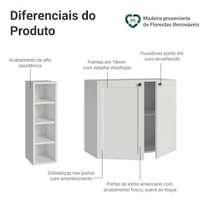 O acabamento de alta resistência da estrutura e das frentes é em Branco, possui uma textura suave ao toque, trazendo leveza e sofisticação ao ambiente. O destaque fica por conta dos puxadores ponto em ouro envelhecido, feitos com metal resistente, trazem personalidade e um charme único. O detalhe chanfrado das frentes forma molduras delicadas e atemporais, no estilo americano.