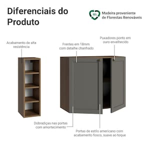 O acabamento de alta resistência da estrutura é no tom amadeirado Rustic e das frentes em Cinza, possui uma textura suave ao toque, trazendo leveza e sofisticação ao ambiente. O destaque fica por conta dos puxadores ponto em ouro envelhecido, feitos com metal resistente, trazem personalidade e um charme único. O detalhe chanfrado das frentes forma molduras delicadas e atemporais, no estilo americano.