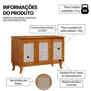 AS IMAGENS SÃO MERAMENTE ILUSTRATIVAS E PODEM SOFRER VARIAÇÕES DE COR E PEQUENOS DETALHES DE ACORDO COM O SEU MONITOR, ILUMINAÇÃO DO AMBIENTE E ATÉ MESMO A SUA PERCEPÇÃO VISUAL.Buffet Aparador com Telinha Palha Deltan Madeira 3p - Castanho