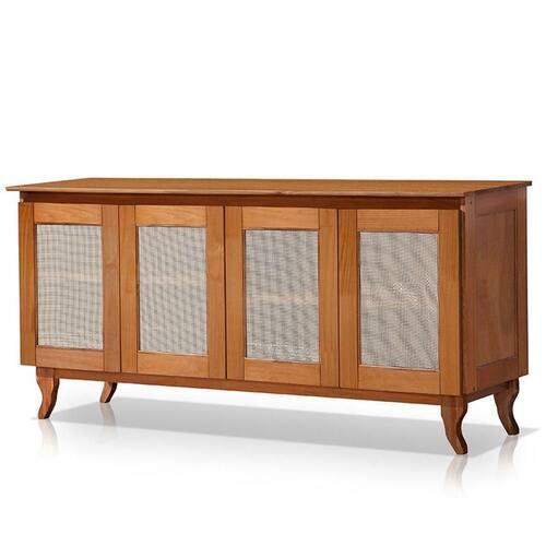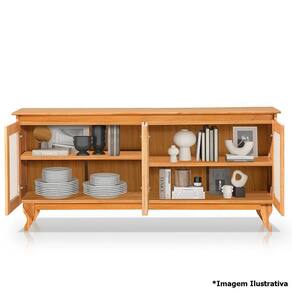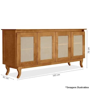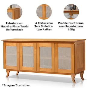 Características do Buffet Aparador de Madeira 4 Portas de Tela Dalton: - Estrutura em madeira pinus taeda de reflorestamento com componetes internos em MDF; - 4 Portas com tela sintética estilo rattan; - Estufada e imunizada; - Peso Suportado por Prateleira: 10kg - Não acompanha objetos decorativos; - Montagem por conta do comprador;