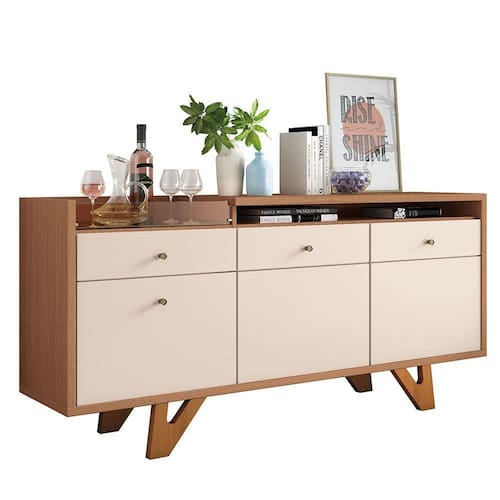 Buffet Aparador Decorativo Noeli Com Bandeja Lateral Estilo Bar Off White / Nature - Gran Belo com beleza única e sua bandeja lateral no estilo bar com vidro reflecta e espelho sobre o tampo te traz charme e sofisticação. Produzido para decorar seu ambiente com a estética ideal, sem perder sua qualidade e praticidade.