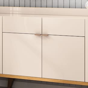 Observações: Buffet elegante produzido em MDP e MDF de 37mm, 25mm e 15mm; 4 Portas com dobradiças laterais; 2 gavetas com corrediças telescópicas; Puxadores em alumínio na cor bronze; Pés de madeira maciça levemente angulados com acabamento envernizado;