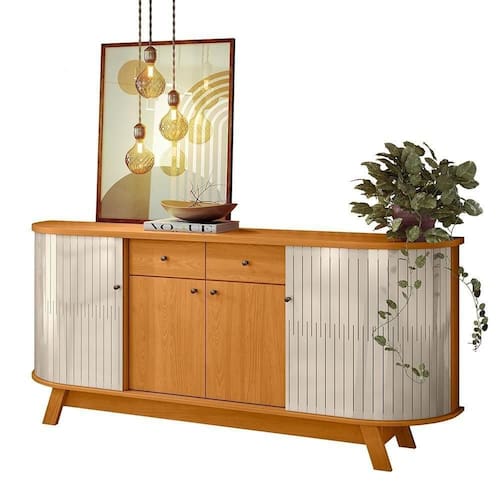 O Buffet Mônaco traz sofisticação e funcionalidade à sala de estar. O detalhe exclusivo da Madetec é a porta curva em MDF, que garante autenticidade, praticidade e um acabamento sofisticado. Possui detalhes curvos no tampo e na base, gavetas com corrediças telescópicas, duas portas com dobradiças metálicas, pés palito, além dos puxadores em bronze que combinam perfeitamente com seu design moderno. É composto por chapas de MDP de 15 e 25mm. Com 183cm de largura, oferece um amplo espaço de armazenamento para utensílios, possuindo gavetas e portas modernas.