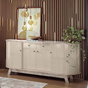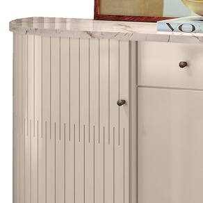 O Buffet Mônaco traz sofisticação e funcionalidade à sala de estar. O detalhe exclusivo da Madetec é a porta curva em MDF, que garante autenticidade, praticidade e um acabamento sofisticado. Possui detalhes curvos no tampo e na base, gavetas com corrediças telescópicas, duas portas com dobradiças metálicas, pés palito, além dos puxadores em bronze que combinam perfeitamente com seu design moderno. É composto por chapas de MDP de 15 e 25mm. Com 183cm de largura, oferece um amplo espaço de armazenamento para utensílios, possuindo gavetas e portas modernas.