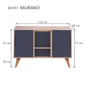 Buffet / Aparador / Balcão Retrô Modelo Murano cor Carvalho Treviso com 2 portas Azul Marinho, o móvel perfeito para deixar seu ambiente com estilo e organizado. Possui dois compartimentos internos com 2 portas laterais e uma prateleira central visível para colocar objetos de decoração. Móvel apoiado em quatro lindos pés torneados em madeira maciça. O móvel apresenta um estilo clean sem puxadores, apenas um recorte nas portas para abrir e fechar. Montagem: Vai desmontado. Cor do Móvel: Madeira Clara (Carvalho Treviso) e portas Azul Marinho. Cor dos pés: Amadeirado de cor clara. Medidas: Largura Total 115cm x Altura Total 77cm x Profundidade Total 40cm, portas A 53cm x L 37cm, pés A 20cm. Material: MDP com espessura 1,5cm . Limpeza: Recomenda-se a limpeza com pano seco ou levemente umedecido. Importante: Este anúncio inclui somente o produto conforme descrição acima. Todos os elementos de decoração das fotos não acompanham o mesmo.