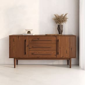 O Balcão Tecca 2 Portas e 3 Gavetas foi criado para quem busca elegância, versatilidade e resistência. Com estrutura em madeira maciça e traços extremamente minimalistas, ele combina proporções equilibradas com um visual limpo que se adapta do jantar ao home office.