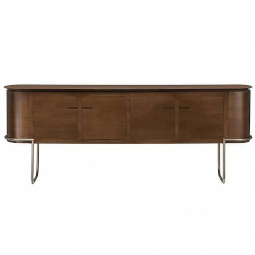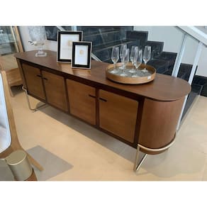 Um Buffet moderno com linhas limpas e livre de excessos. permitindo que se adequa a qualquer ambiente ou decoração, possui ótimo aproveitamento interno contemplando quatro portas e prateleiras internas. O buffet Curve é fabricado em MDF com lâminas de madeira maciça, pés em aço carbono, 4 portas com amortecedor e acabamento em poliuretano e ultravioleta o que permite que a água e o álcool não machem se entrarem em contato (limpar dentro de 2 horas).