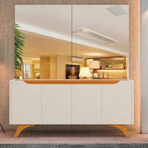 O Buffet Grecia conta com design clean e sofisticado com cantos arredondados em MDF, quatro portas com dobradiças de 35mm slow motion e batente de silicone com fechamento silencioso, para melhor durabilidade do seu móvel, Possui também uma prateleira interna e pés de madeira maciça. As cores disponíveis são off white e off white com naturalle.
