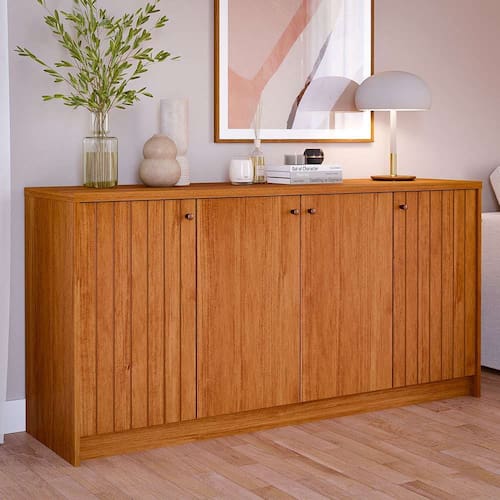 que tal o buffet lia?buscando por uma maneira elegante de organizar sua sala de jantar ou estar? o buffet lia é a resposta. enquanto as divisões internas oferecem espaço generoso para guardar louças, taças e outros utensílios essenciais para momentos de confraternização, o tampo espaçoso é perfeito para exibir suas hores receitas em bandejas durante refeições em família, ou para destacar itens decorativos no dia a dia. já o design moderno com uma combinação de acabamento madeirado, detalhe ro e puxadores discretos adiciona um toque de elegância e sofisticação ao ambiente. agora, seu lar-style ficará completo de verdade. Marca: Modern