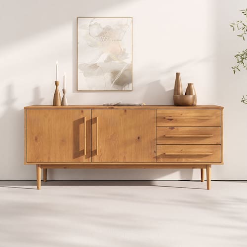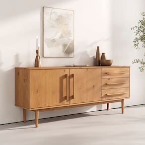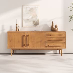 As duas portas com puxadores verticais e as três gavetas com puxadores horizontais, todos esculpidos na própria madeira, garantem uma frente contínua e harmoniosa. Os pés cônicos retos elevam a base e reforçam a leveza visual, enquanto os compartimentos internos acomodam louças, utensílios, livros ou objetos de apoio com praticidade.
