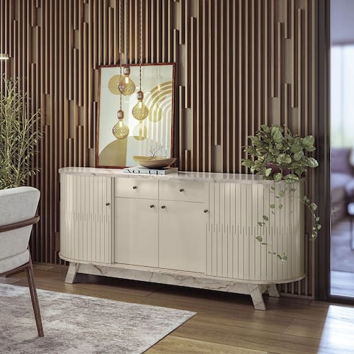 Características: Estrutura em MDP Pintura semi brilho Portas deslizantes em MDF Corrediças Telescópicas Dobradiças Metálicas Pés Retrô Puxadores de Plástico Tampo e base com detalhes curvos.