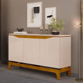 Buffet DJ Móveis Nice 3 Portas 2 Prateleiras e Pés Inclusos Uma ótima solução para sua casa, o Buffet Nice é o complemento ideal para compor a sua sala de jantar. Possui um design moderno e sofisticado, contando com um tampo com borda chanfrada e espessura de 25mm, que também proporciona muito mais resistência. Com três portas de giro em MDF com detalhe usinado, além de duas prateleiras internas você terá espaço para guardar seus objetos e utilidades domésticas organizadamente, é um móvel prático e funcional.