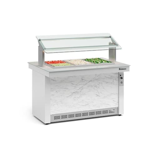 Buffet Refrigerado 6 Cubas Gbrf140 Gelopar 6gns 220v Branco E Mármore Buffet Vitra refrigerado GBRF140 Gelopar. Para conservação e exposição de alimentos. Refrigeração: Estática com serpentina embutida no tanque. Temperatura: 0 a +7C. Controle de Temperatura: Termostato. Revestimento interno da base: Aço pré-pintado, saia e passagem de ar em aço revestido. Revestimento externo do tanque: Aço Inox 304. Iluminação LED. Pés niveladores. Protetor salivar com ajuste de posição em vidro temperado. Tampo em vidro com serigrafia. Capacidade de cubas sugerida: 6. Não acompanha Cubas. CONSUMO: 4,49 kWh/dia. TEMPERATURA: 0 a +7C. PESO: 66Kg. DIMENSÕES EXTERNAS (CxAxL): 138,8x120,5x100cm. Equipamento certificado conforme Portaria Inmetro n 371/2009. Buffet Vitra refrigerado GBRF140 Gelopar é na Atau. Marca - Gelopar Modelo - GBRF140 Quantidade de Cubas - 6GNs Frente - 1,38m Altura - 1,20m Profundidade - 1,00m Temperatura - 1 a +7C. Peso - 66 Kg Consumo - 4,49 kWh/h