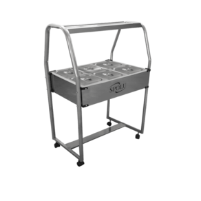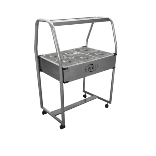 O Buffet Salada 6 cubas SPOLU tem a função de manter suas saladas e alimentos conservados e resfriados enquanto em exposição. Acompanha 6 unidades de gelo-x, componete essencial para manter a temperatura resfriada. Possui cubas fabricadas em aço inox 201, tampas e moldura externa em aço inox 430 e estrutura de sustentação tubular. É de fácil mobilidade e manuseio devido a estrutura tubular que é dotada de rodízios giratórios