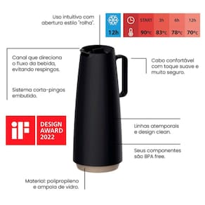 Preparar seu café ou chá e garantir a temperatura ideal para eles durante muito mais tempo, o bule térmico Tramontina Exata em polipropileno preto com ampola de vidro 1 litro é indispensável! Seu design é diferenciado e conta com linhas minimalistas e atemporais que oferecem maior estilo a sua mesa e a sua cozinha. Ele é produzido em polipropileno, tem ampola de vidro e pode ser utilizado tanto para líquidos quentes, quanto frios. Sua abertura é em formato rolha com corta-pingos embutido e é de uso seguro, leve e muito confortável. Além de todas essas características, o bule ainda é muito fácil de limpar e vai levar muito mais praticidade a sua cozinha!