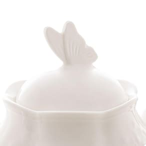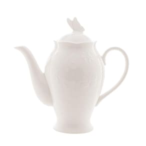 Bule em porcelana branca, com flores e borboletas em alto relevo, o item ideal para tornar a hora do cafézinho ou do chá ainda mais alegre, com muita elegância e bom gosto!