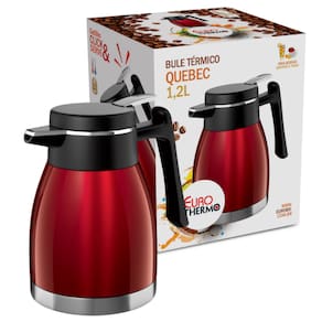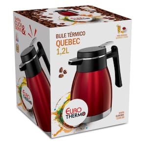 O Bule Térmico Quebec 1,2L da Euro Thermo oferece praticidade e elegância para quem busca conservar bebidas quentes ou frias por longos períodos. Fabricado integralmente em aço inoxidável, conta com parede dupla, garantindo a preservação da temperatura de líquidos por até 12 horas para bebidas quentes e até 24 horas para bebidas frias (seguindo as recomendações de uso). Seu design exclusivo possui pintura brilhante, agregando charme à sua cozinha ou escritório. O acionamento por gatilho proporciona muito mais segurança e higiene ao servir, diferenciando-o dos modelos tradicionais do mercado.