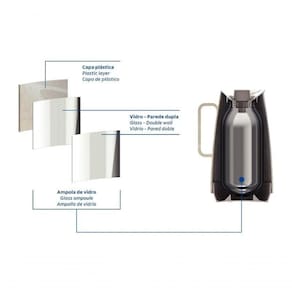 Modo de Uso: ;Recomendamos pré-aquecer/pré-refrigerar o produto com água antes do uso para manter a bebida aquecida/fria por mais tempo. Para evitar vazamentos, não encha o produto até o seu topo. Não agite o produto; Não olhe diretamente para dentro; Não coloque gelo seco, refrigerante, bebidas gaseificadas ou líquidos que possam gerar alta pressão; Cuidado ao manusear o produto, não deixe bater ou cair. Se vier a acontecer, certifique-se que não fiquem resíduos de vidro no interior; Todo manuseio de vidro (material frágil) deve ser feito com total atenção, e este produto com ampola de vidro não foge a essa regra; Não beba diretamente da garrafa; Verifique frequentemente o aperto das peças rosqueáveis (fundo/base); Não coloque bebida quente e, em seguida, bebida gelada ou vice-versa, pois isso pode danificar a ampola; Mantenha fora do alcance das crianças; Após o uso ou limpeza, aconselhamos deixar o produto aberto; Não remova a ampola de vidro do produto, somente se ela quebrar ou sofrer algum dano e houver necessidade de substituição; Não use o produto para transportar ou armazenar cubos de gelo, pois podem danificar a parte interna do bule; Para minimizar o crescimento de bactérias, não use o produto para guardar leite quente ou comidas de bebês. Lave o produto somente com detergente neutro e esponja macia; Não utilize escova com pontas que possam quebrar a ampola de vidro; Se houver odores desagradáveis, utilize uma solução com a medida de uma colher (sopa) de bicarbonato de sódio dissolvida em água quente (capacidade máxima) e deixe agir por 12 horas; após, enxague bem e realize a limpeza diária.