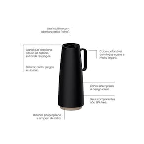A capacidade volumétrica poderá ter uma variação de até 10% emseu volume nominal linhas atemporais e design clean, o bule térmico da linha Exata combina com qualquer estilo e para manter líquidos quentes ou frios na temperatura adequada por muito mais intuitivo com abertura estilo que direciona o fluxo da bebida, evitando respingos.Sistema corta-pingos confortável com toque suave e muito .Robusto, simples e moderno, ocupa menos espaço na sua casa e durante o .Praticidade no uso e para toda a famí e fácil de componentes são BPA ênico e de fácil limpeza.Material: polipropileno e ampola de vidro.