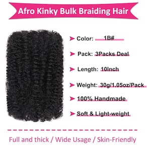 - Material do cabelo Afro Kinky Bulk: o cabelo a granel afro kinkys da Unionbeauty é feito de fibras sintéticas de alta qualidade, cabelo crespo crespo macio trançado sem cheiro, combina exatamente com a textura do seu próprio cabelo, parece muito natural, é macio e não prejudica a pele
