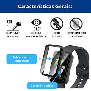Proteção contra arranhões e impactos: A capa acrílica 360º envolve todo o corpo do smartwatch, incluindo a tela e laterais, oferecendo uma proteção completa contra arranhões, impactos e quedas.
