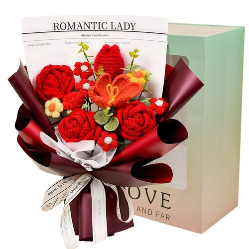 Descrição do produto: Traga o calor e o charme da arte artesanal para sua casa com o buquê de flores de crochê Wishwell Pop Cada flor de crochê é cuidadosamente trabalhada a partir de fios de alta qualidade, criando flores suaves e realistas que iluminarão qualquer espaço. Ao contrário das flores frescas tradicionais, estas flores de malha são ecológicas, reutilizáveis e não requerem manutenção, oferecendo uma alternativa de longa duração para aqueles que querem uma bela exibição duradoura. Perfeito para decoração de casa, casamentos e como um presente sincero, este buquê de flores de crochê adiciona um toque único e pessoal a qualquer ocasião. Se você está procurando surpreender seu melhor amigo com um presente de crochê atencioso ou melhorar seu espaço de vida com um arranjo floral artístico, essas flores são projetadas para causar uma impressão duradoura. - Buquê de flores de crochê: este buquê de tamanho moderado, aproximadamente 40 cm de altura e 25 cm de largura, inclui 3 rosas vermelhas de crochê grandes, 1 rosa de crochê, 1 tulipa de crochê, 6 margaridas e 4 plantas artificiais de eucalipto. Tem um visual requintado e elegante. Cada flor é feita à mão com fio de algodão macio, tornando cada uma única e adicionando uma agradável sensação de artesanato a qualquer casa - Materiais seguros e de alta qualidade: feito de fio de algodão leite, este buquê de flores de crochê não tem cheiro peculiar. É seguro, altamente realista e adequado para pessoas com alergias a flores - Presente perfeito para entes queridos: este buquê de flores de crochê embrulhado é um presente ideal para sua mãe, irmã, esposa ou namorada em ocasiões especiais como aniversário de casamento, dia dos namorados, dia das mães e outros festivais. É um presente atencioso para amantes, amigos e professores. - Decoração de casa: Estas lindas flores nunca desbotam, tornando-as perfeitas para decorar vários espaços, como sala de estar, mesa, prateleira e balcão. Elas também são ideais para buquês de noiva e decorações de flores, centros de mesa, quartos, escritórios, casamentos, festas e muito mais - Requintadamente embalado para ocasiões especiais: cada buquê é meticulosamente embrulhado e apresentado em uma elegante caixa de presente, tornando-o o presente perfeito para aniversários, Natal, Dia dos Namorados e Dia das Mães. É uma maneira ideal de surpreender e encantar as mulheres especiais em sua vida.